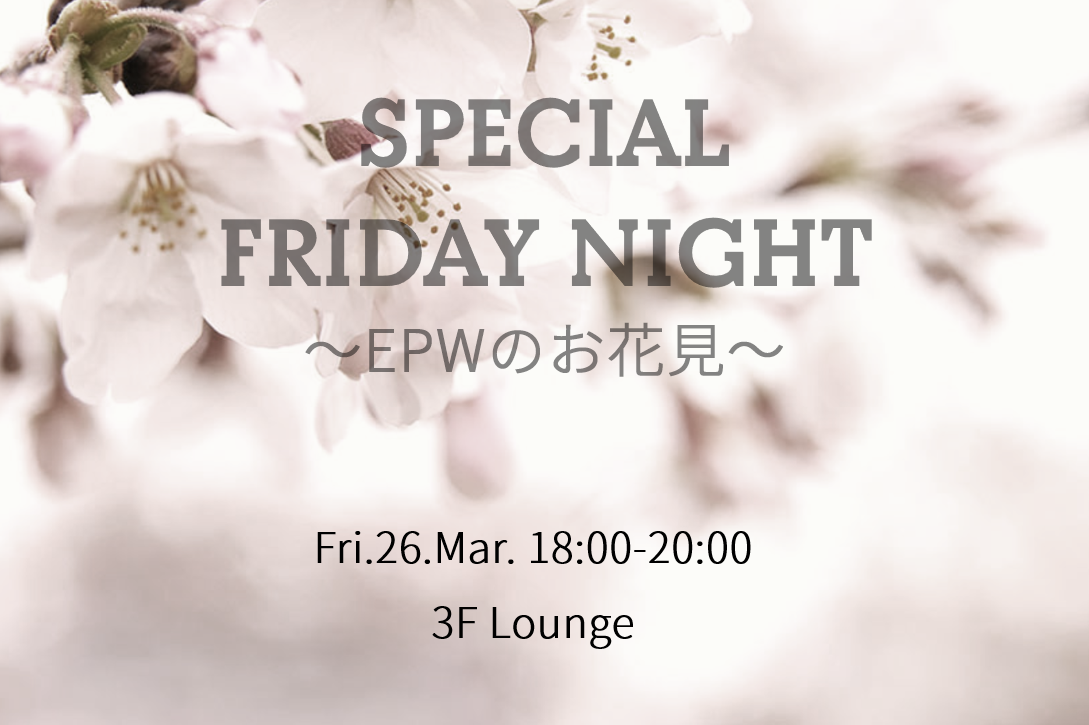 We want to enjoy “cherry blossom viewing party” with EPW members, and we will resume SPECIAL FRIDAY NIGHT. You can enjoy the cherry blossoms at the Lounge area and terrace of the 3rd floor and a cherry blossom cocktail by a bartender.